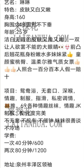位置坐标:丰泽区领袖上课花费: 600颜值身材:人照基本无差,有点美颜磨皮大家都懂服务内容:课表流程完成度高出击体验:从去年到今年出击多次了,已配合熟练,激情不见,依旧水嫩,皮肤丝滑,配合度高,才6张要啥自行车。优点缺点:胸部我要揉到D推荐程度:9.5 差0.5继续努力