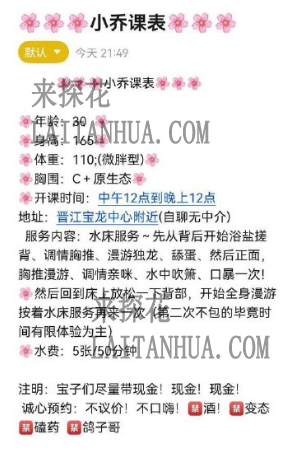 服务内容:水床服务先从背后开始浴盐搓遍全身、然后调情胸推、漫游独龙、舔蛋、然后搓正面,胸推漫游、调情亲咪、水中吹箫、口暴一次!