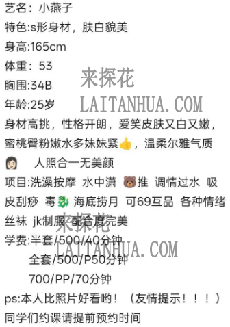 学费:半套/400/40分钟 全套/500/P/50分钟 700/PP/70分钟 900/不限次数/90分钟 水床+100 小姐联系方式: