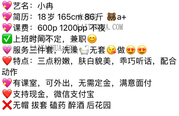 💖艺名:小冉💖简历:18岁 165cm 86斤 🐻B💖课费:600p 1200pp 不夜✅上班时间不定,兼职😊💗服务三件套,洗澡🛀🏻无套口 做😍😍可以亲胸哟❤️特点:三点粉嫩,肤白貌美,乖巧听话,配合动作💖有课室,可外出,满意面付❤️支持现金,微信支付宝❌无帽 拔套 磕药 醉酒 后花园 小姐联系方式: