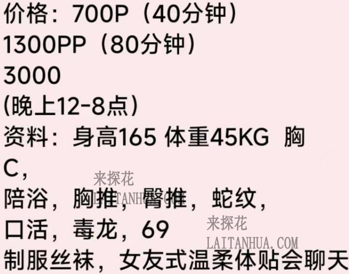 艺名:蒙蒙年龄:25体重:50身高:165胸围:c产地:湖南服务内容陪浴,胸推,裸吹,🐍吻,口爆,毒🐉,69,制服一次价格: 700 时长:40 分钟两次价格:1300 时长:80 分钟包时价格: (无)包夜 时长:23点到7点城市:上海地区:浦东,禁忌:桩基 磕药 拔套 粗鲁 口臭 口嗨 鸽子 皮肤病 屌特大 吸毒 醉酒 低素质 小姐联系方式: