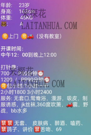 近期来上海出差,决定尝试一下上海的LS。从群里看了看,酥甜老师比较有感觉。看介绍,老师没有教室,这倒无所谓,反正我也是在酒店,约好时间和PP的课程,老师打车过来。个人感觉真人比照片更好看一些,湖北妹子,皮肤光滑,小麦色。年龄24、5吧,🐻 大约A+,本狼不是匈奴,符合我的审美标准。进来以后是陪浴,关键部位清洗干净,然后开始工作,老师服务很好,课表上的内容都有,不能🐍 和69,这在课表上也说明了。然后戴上雨伞开始工作,女上小桩基,过程很满意。然后休息了一会儿,聊了聊天,再开始第二轮,过程依旧满意,给老师和我累得不行。总体来说,非常值得推荐。