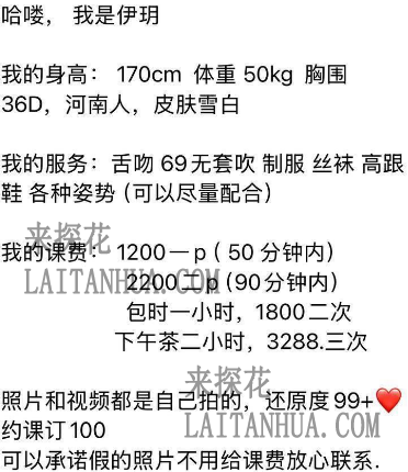 哈喽, 我是伊玥我的身高: 170cm 体重 50kg 胸围 36D纯天然,无科技,河南人,皮肤雪白,年龄23,我的服务:舌吻 69无套吹 制服 丝袜 高跟鞋 各种姿势(可以尽量配合)我的课费: 1200一p( 50 分钟内)2200二p(90分钟内)包时一小时,1800二次下午茶二小时,3288.三次照片和视频都是自己拍的,还原度99+❤️ 约课订100可以承诺假的照片不用给课费放心联系.不能接受❌ 无套 皮肤病 没有素质的 超大的也不行谢谢你们的喜欢 爱你们❤️