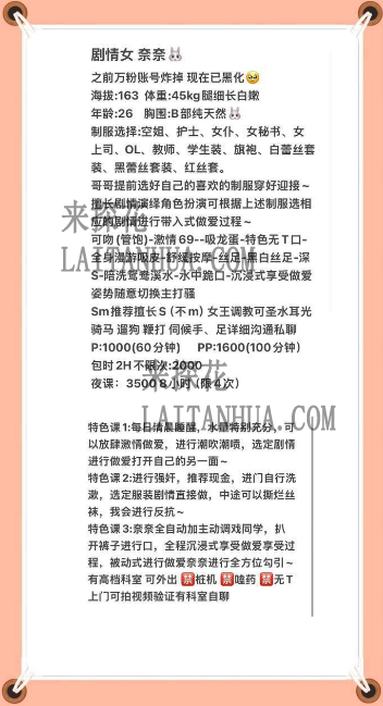 课表上的都有,除了天冷没浴室戏份小问题出击体验:找奈奈约好了时间怕迟到早早就出发了,地铁站出口走小段路就到方便,不用登记,一进门惊讶到我了,穿着灰色侧开叉连衣裙腿又长,豆豆若隐若现,声音也很温柔动听,比频道里好看太多非常的御姐,坐下闲聊了一会得知奈奈今天生日我是第一个也是非常的巧,因为我没玩过剧情也没选,服装很多我有点选择困难症就让奈奈自己挑了件白色蕾丝,趁奈奈换衣服我自己去洗了澡,没有共浴也无所谓比较冷,洗完帮忙擦身子,就躺床上开始全身漫游,服务细致知道我咪咪比较敏感还特意咬了一下,口活也是非常的厉害,加上那张脸根本受不了,女上也是非常的爽一直挑逗我,奈奈累了就换传教士,腿很长而且柔韧性也很好,抱着的时候头发香香的,接着想换姿势也没换成(ps状态不好感觉累累的今天只睡了两小时),换成了床边传教士加上奈奈骚话一抖一抖下顺利出水,其实也挺久的20分交的水费,12点结束,洗完澡抱着聊了会天,歇了一会下楼吃KFC去备战第二场了。(奈奈真的长的很合我胃口,会返下次试试剧情和其他服装,sm有点不敢,满分推荐!)