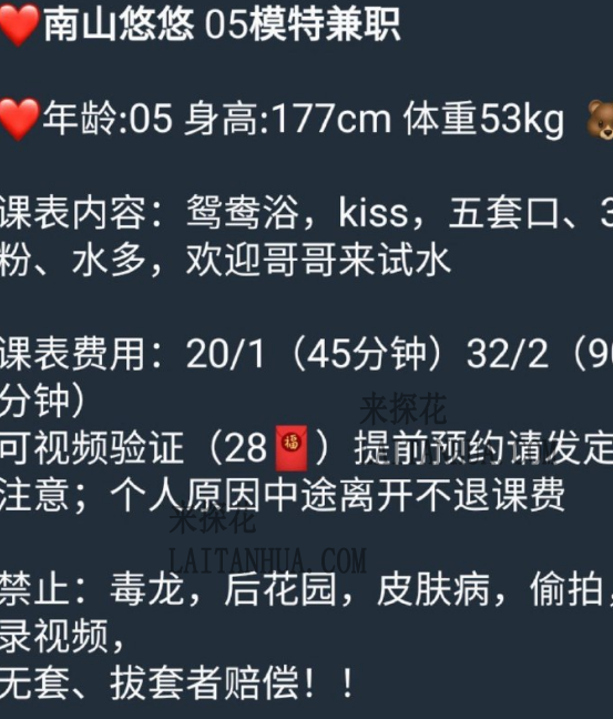❤️南山悠悠 05模特兼职❤️年龄:05 身高:177cm 体重53kg 🐻D课表内容:鸳鸯浴,kiss,五套口、3点粉、水多,欢迎哥哥来试水课表费用:20/1(45分钟)32/2(90分钟)5k(3小时下午茶)夜8888(8小时)可视频验证(28🧧)提前预约请发定金注意;个人原因中途离开不退课费禁止:毒龙,后花园,皮肤病,偷拍,录视频,嗑药,无套、拔套者(后果自负)