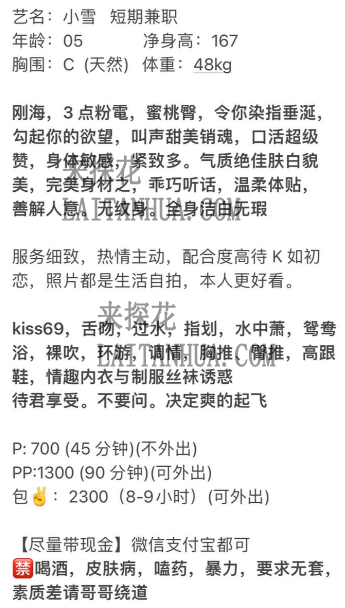 艺名:小雪 短期兼职年龄:05 净身高:167胸围:C (天然) 体重:48kg刚海,3 点粉電,蜜桃臀,令你染指垂涎,勾起你的欲望,叫声甜美销魂,口活超级赞,身体敏感,紧致多。气质绝佳肤白貌美,完美身材之,乖巧听话,温柔体贴,善解人意。无纹身。全身洁白无瑕服务细致,热情主动,配合度高待 K 如初恋,照片都是生活自拍,本人更好看。kiss69,舌吻,过水,指划,水中萧,鸳鸯浴,裸吹,环游,调情,胸推、臀推,高跟鞋,情趣内衣与制服丝袜诱惑待君享受。不要问。决定爽的起飞P: 700 (45 分钟)(不外出)PP:1300 (90 分钟)(可外出)包✌️:2300(8-9小时)(可外出)【尽量带现金】微信支付宝都可🈲喝酒,皮肤病,嗑药,暴力,要求无套,素质差请哥哥绕道小姐联系方式: