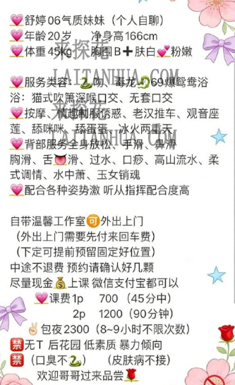 进门看到老师就是一股青春气息,完美无缺,老师有点憨憨的,就是那种刚毕业的女孩,但这不妨碍我这老司机的操作,逢山开路 遇水填桥,各种弯道漂移得心应手,老师也很配合,各种姿势,虽然略显生疏,但极大的激发了我的探索欲,不单单价格优惠,总之很满足这趟旅程,这趟来得很值,非常棒 小姐联系方式: