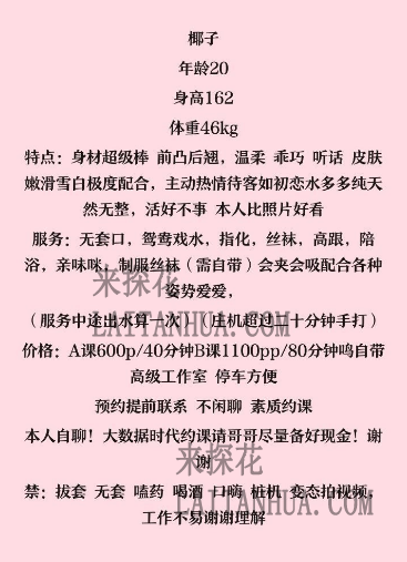 压抑许久终于出击一次,主要找些嫩妹出击,看到椰子视频照片觉得不错就约时间去到是短租公寓,入房后看到老师本人人照也符合,白白嫩嫩,年纪很小,简单聊几句就去洗澡,椰子也过来帮洗,服务很周到,上二楼躺下等服务,没想到老师的👄真的一流,而且很认真,不喊停一直在👄,嫩妹也有好服务,差点忍不住然后喊老师戴好女上,椰子化身电动小马达,同时附身到耳边脖子呻吟,差点就当场缴械,后面就正常的传教士,后入321结束战斗,总的来说人美服务态度好,喜欢嫩妹的可以出击,口技也一绝。 小姐联系方式: