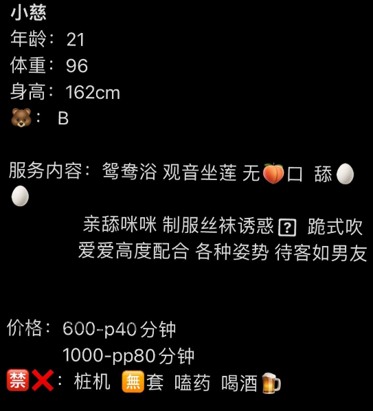 跟姑娘订好课程,还修改了一次时间,小慈态度很好很有耐心,服务也很到位,是很舒服的新人老师温柔的感觉。按照老师的指示上楼后,进门就觉得很年轻很满意,而且纹身其实蛮可爱的哈哈,御姐脸蛋又小家碧玉邻家女孩其实很戳我,很希望能有下次,这次因为个人时间只一课但是整体体验非常好。住的地方简单简约干净,会在开始结束服务洗澡,希望约老师的都很有礼貌一样温和。老师不愿意就不要强求。总结,很满意啦。 小姐联系方式: