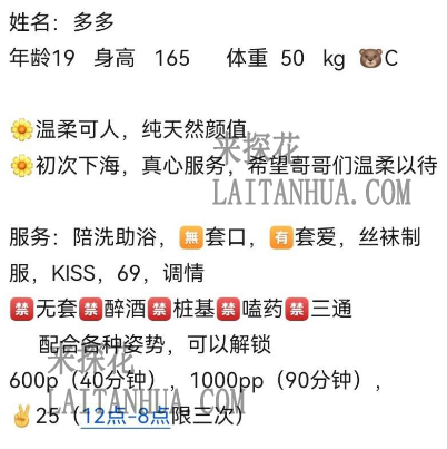 姓名:多多年龄19 身高 165 体重 50 kg 🐻C🌼温柔可人,纯天然颜值🌼初次下海,真心服务,希望哥哥们温柔以待服务:陪洗助浴,🈚套口,🈶套爱,丝袜制服,🐍吻,69,调情🈲无套🈲醉酒🈲桩基🈲嗑药🈲三通配合各种姿势,可以解锁600p(40分钟),1000pp(80分钟), 小姐联系方式: