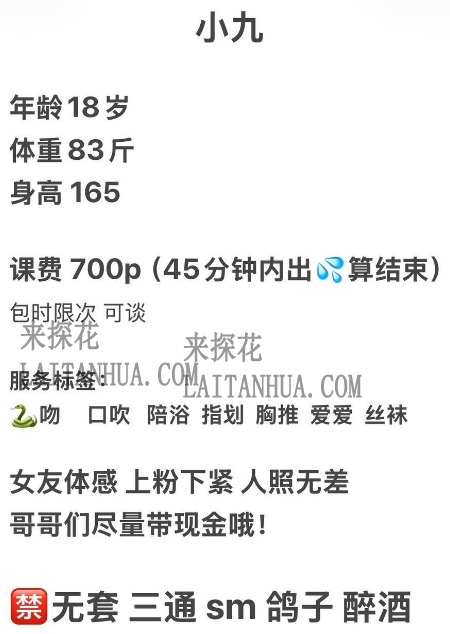 本人比照片好看,有美颜美白,看起来挺小的,有花臂花腿,个子高,老师比较弱,体重是真实的,喜欢苗条的没问题,喜欢肉多的就得考虑一下了。嫩妹三件套,服务认真,虽然服务少,但妹子态度好,口的很舒服,没有任何齿感,不叫停就不停,小区单元楼开的民宿,比较安全。两室一厅,房间收拾的干净整洁,和妹子约好时间,准时到达。进门和妹子寒暄几句,妹子性格外向,东北人,很能聊。脱衣洗澡,妹子陪着一起洗,洗完上床,干活,流程下来女上起手,换了两个姿势被妹子拿下。做的时候和妹子舌吻,蛇的比较通透,感觉也很不错,一点都不机车。能给到不错的情绪价值。约到妹子虽然没什么服务,但她是苗条的嫩妹啊,做的感觉给人还是不错的,做完很满足。喜欢嫩妹,喜欢苗条身材的狼友可以出击。